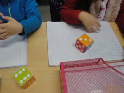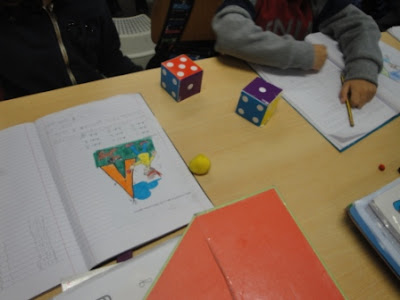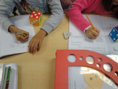 Depois de termos construído um dado na sequência da aula de matemática sobre os sólidos, lançámos os dados a pares e descobrimos muitas combinações possíveis com os dois dados. Houve um grupo que conseguiu descobrir 36 formas de juntar os diferentes números. Foi uma aula muito dinâmica e diferente. E se lançarmos 3 dados? Já experimentaram?