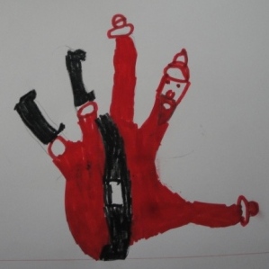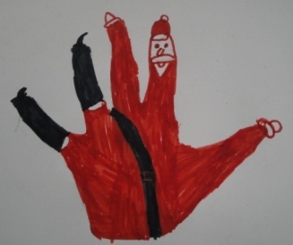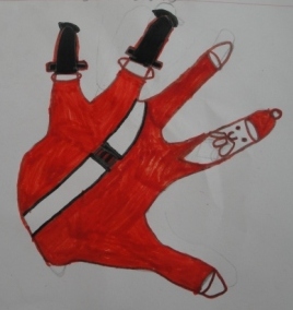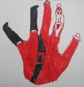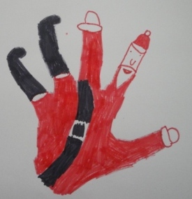Para a construção do Pai Natal, a professora contornou as nossas mãos em cartolina que depois recortámos. A seguir pintámos o barrete e a cara do Pai Natal e a professora colou umas bolinhas de peluche para fazer a barba. Que tal?