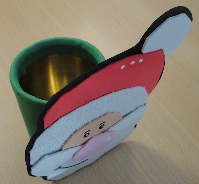 E este foi o trabalho que fizemos para decorar a nossa sala lá de casa. Recortámos a cara do Pai Natal em EVA que foi colada numa lata também forrada com o mesmo material. Além de decorativo, este trabalho pode ter outras utilidades.