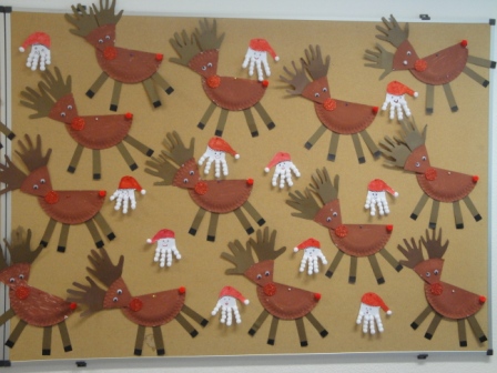 Para fazermos as renas, pintámos com tinta castanha o corpo e a cabeça feitos com pratos de papel e recortámos pelo contorno as nossas mãos que fazem de hastes.